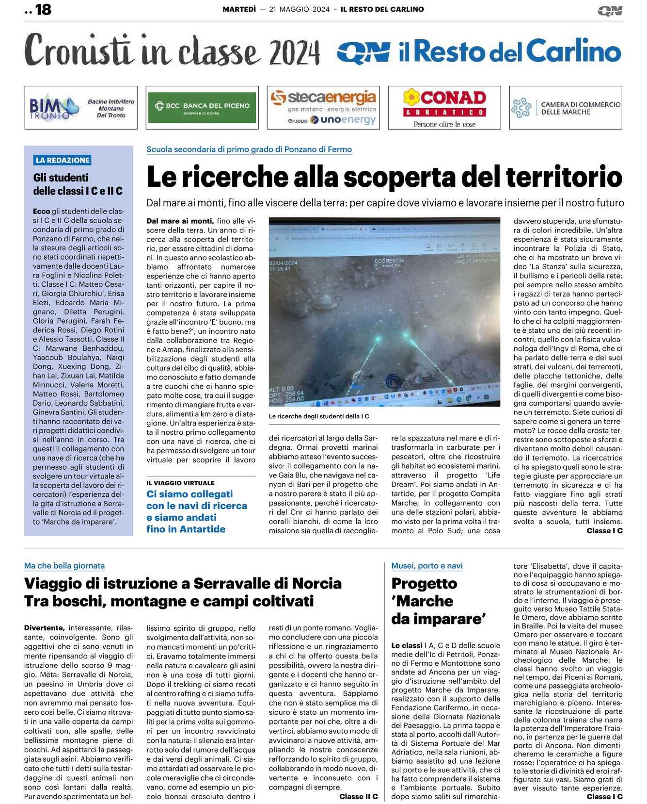 Ecco gli studenti delle classi I C e II C della scuola secondaria di primo grado di Ponzano di Fermo, che nella stesura degli articoli sono stati coordinati rispettivamente dalle docenti Laura Foglini e Nicolina Poletti. Classe I C: Matteo Cesari, Giorgia Chiurchiu’, Erisa Elezi, Edoardo Maria Mignano, Diletta Perugini, Gloria Perugini, Farah Federica Rossi, Diego Rotini e Alessio Tassotti. Classe II C: Marwane Benhaddou, Yaacoub Boulahya, Naiqi Dong, Xuexing Dong, Zihan Lai, Zixuan Lai, Matilde Minnucci, Valeria Moretti, Matteo Rossi, Bartolomeo Dario, Leonardo Sabbatini, Ginevra Santini. Gli studenti hanno raccontato dei vari progetti didattici condivisi nell’anno in corso. Tra questi il collegamento con una nave di ricerca (che ha permesso agli studenti di svolgere un tour virtuale alla scoperta del lavoro dei ricercatori) l’esperienza della gita d’istruzione a Serravalle di Norcia ed il progetto ‘Marche da imparare’.