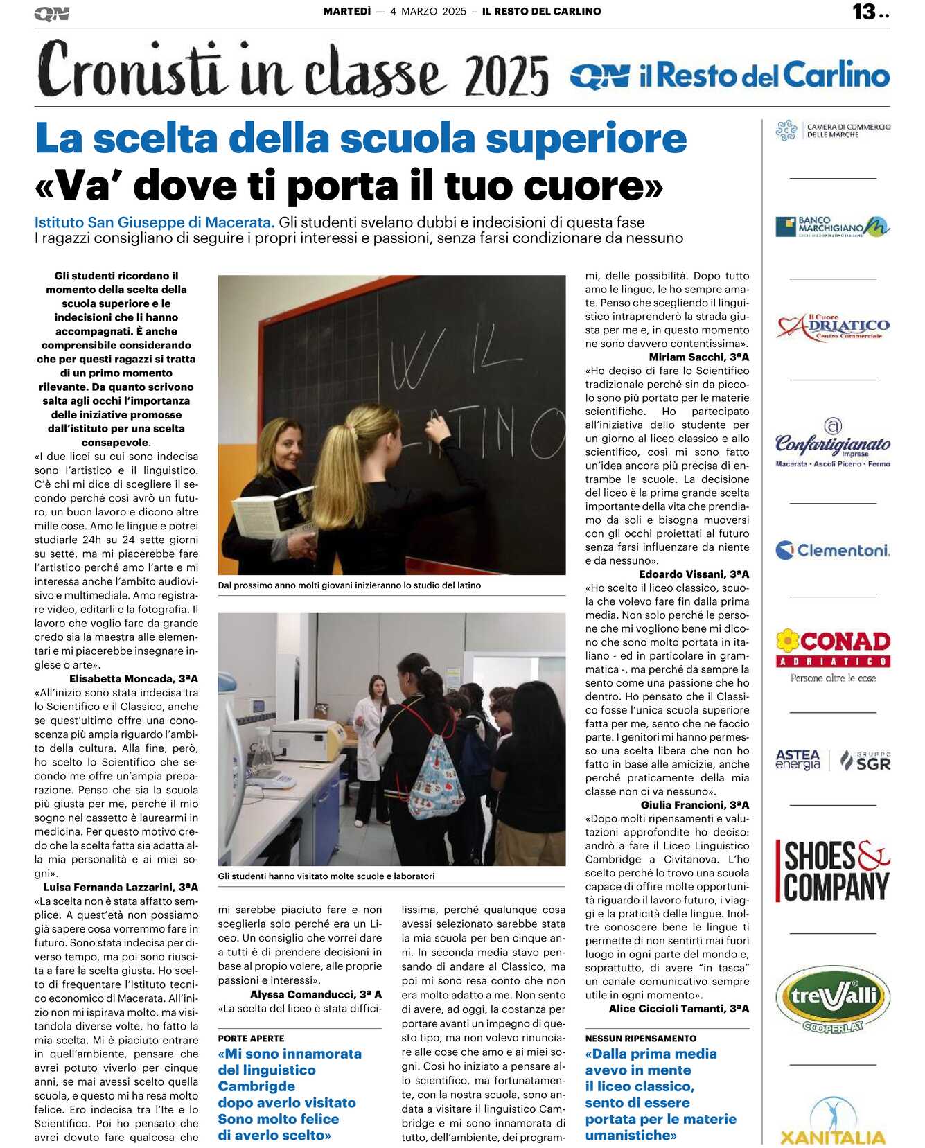 «Dopo molti ripensamenti e valutazioni approfondite ho deciso: andrò a fare il Liceo Linguistico Cambridge a Civitanova. L’ho scelto perché lo trovo una scuola capace di offrire molte opportunità riguardo il lavoro futuro, i viaggi e la praticità delle lingue. Inoltre conoscere bene le lingue ti permette di non sentirti mai fuori luogo in ogni parte del mondo e, soprattutto, di avere “in tasca” un canale comunicativo sempre utile in ogni momento».