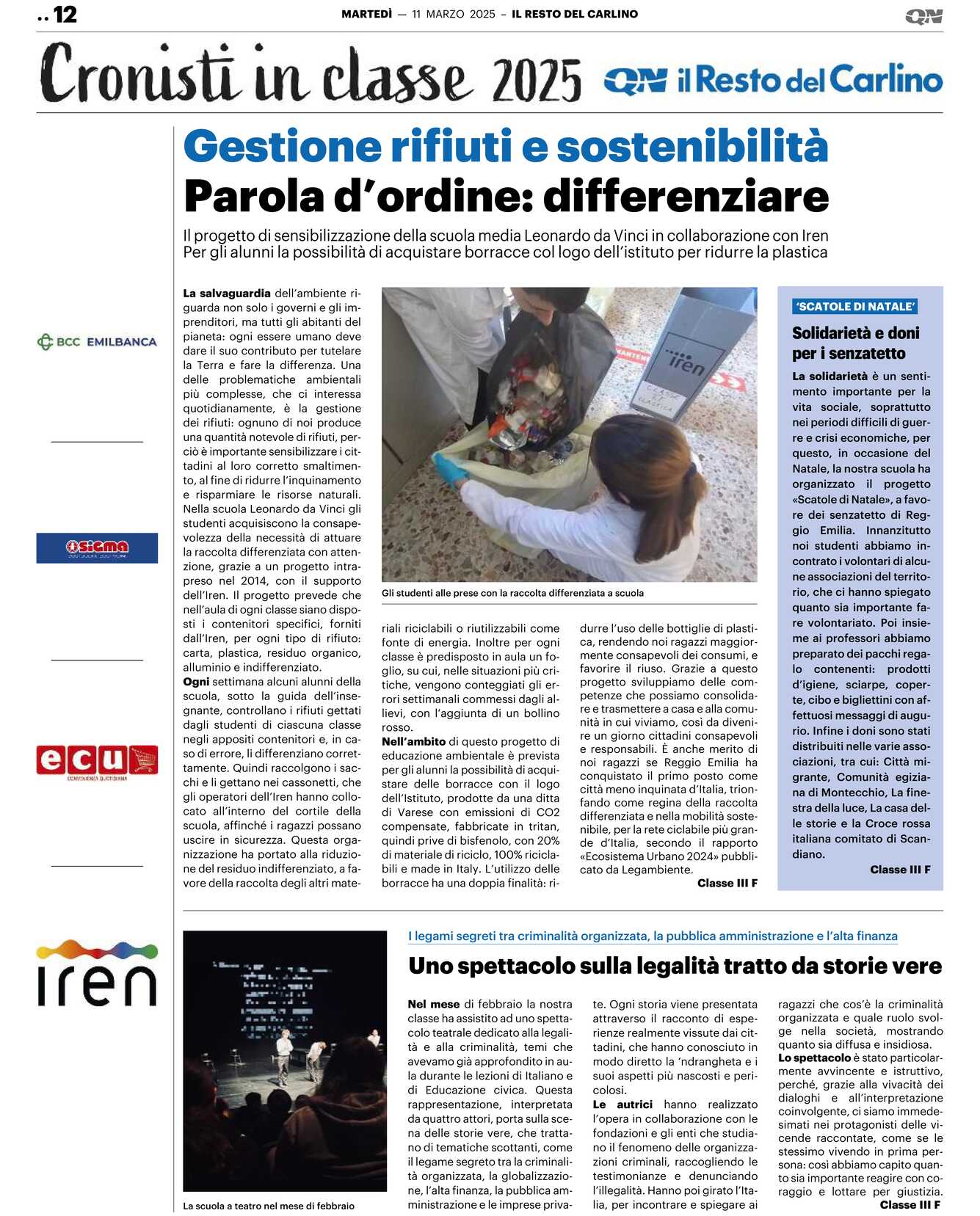 Nella scuola Leonardo da Vinci gli studenti acquisiscono la consapevolezza della necessità di attuare la raccolta differenziata con attenzione, grazie a un progetto intrapreso nel 2014, con il supporto dell’Iren. Il progetto prevede che nell’aula di ogni classe siano disposti i contenitori specifici, forniti dall’Iren, per ogni tipo di rifiuto: carta, plastica, residuo organico, alluminio e indifferenziato.