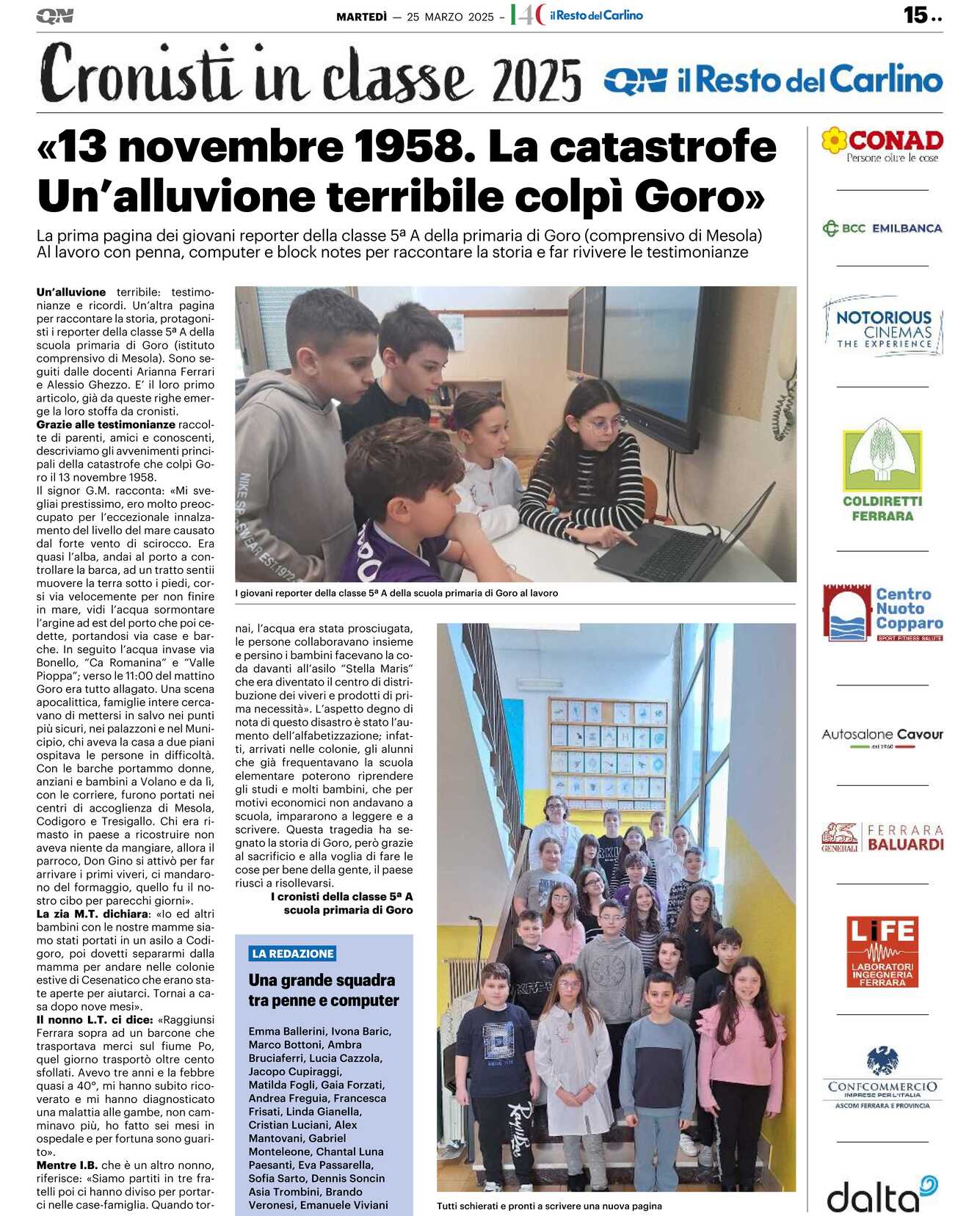 Un’alluvione terribile: testimonianze e ricordi. Un’altra pagina per raccontare la storia, protagonisti i reporter della classe 5ª A della scuola primaria di Goro (istituto comprensivo di Mesola). Sono seguiti dalle docenti Arianna Ferrari e Alessio Ghezzo. E’ il loro primo articolo, già da queste righe emerge la loro stoffa da cronisti.