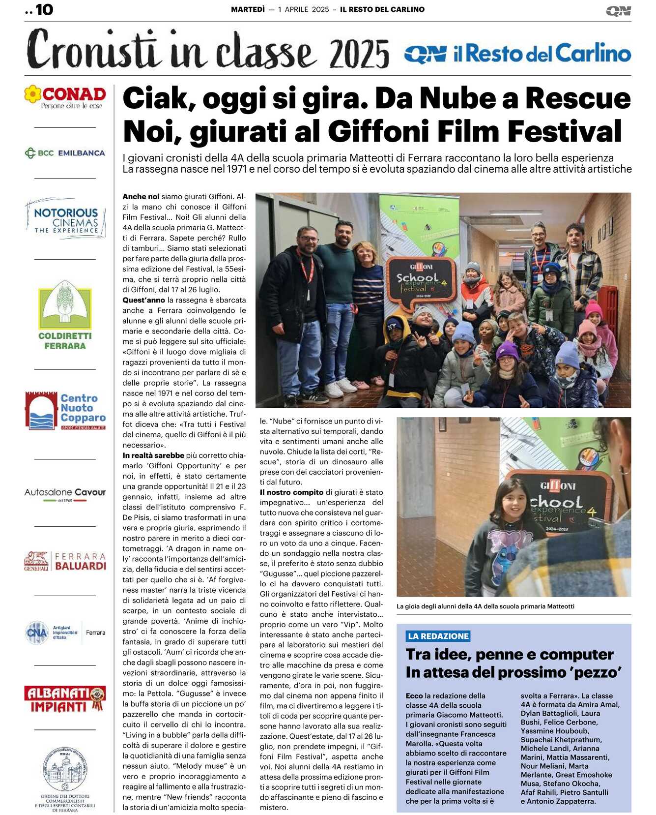 I giovani cronisti sono seguiti dall’insegnante Francesca Marolla. «Questa volta abbiamo scelto di raccontare la nostra esperienza come giurati per il Giffoni Film Festival nelle giornate dedicate alla manifestazione che per la prima volta si è svolta a Ferrara». La classe 4A è formata da Amira Amal, Dylan Battaglioli, Laura Bushi, Felice Cerbone, Yassmine Houboub, Supachai Khetprathum, Michele Landi, Arianna Marini, Mattia Massarenti, Nour Meliani, Marta Merlante, Great Emoshoke Musa, Stefano Okocha, Afaf Rahili, Pietro Santulli e Antonio Zappaterra.