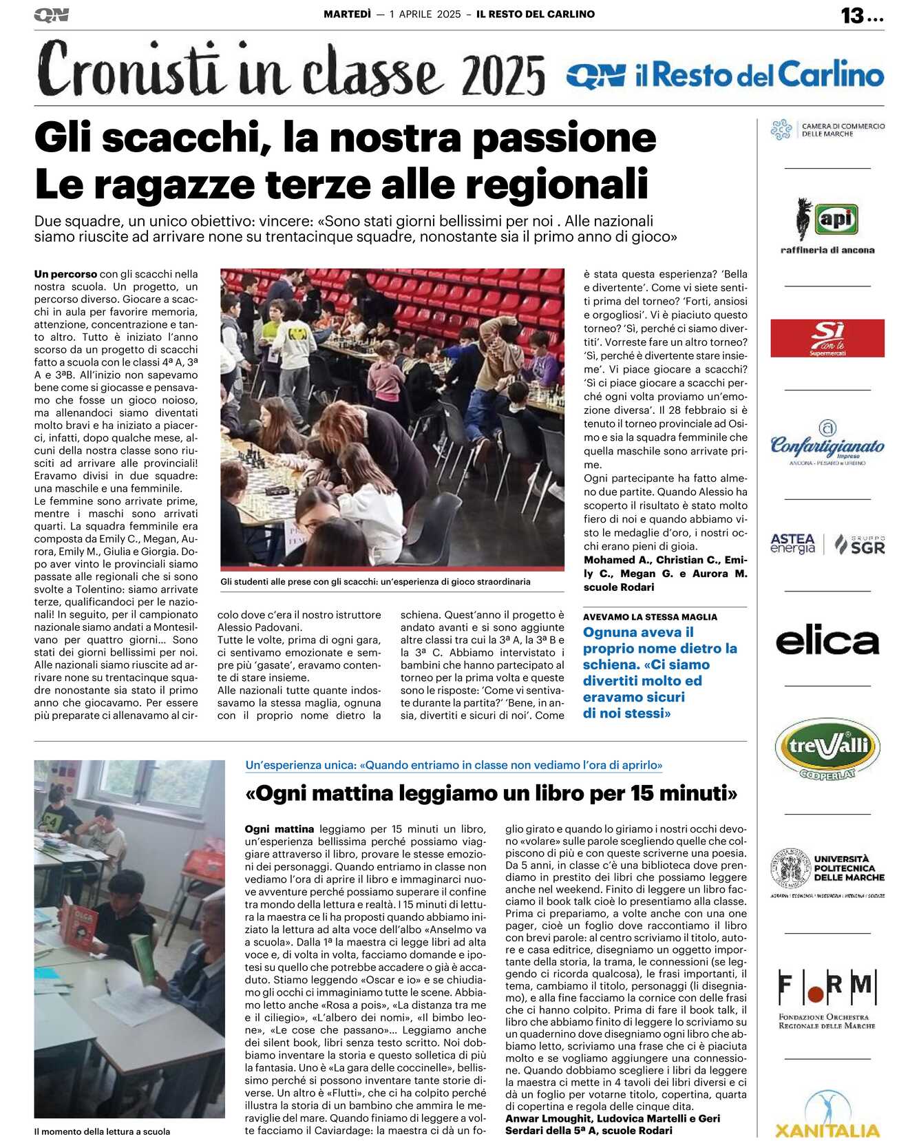 Alle nazionali tutte quante indossavamo la stessa maglia, ognuna con il proprio nome dietro la schiena. Quest’anno il progetto è andato avanti e si sono aggiunte altre classi tra cui la 3ª A, la 3ª B e la 3ª C. Abbiamo intervistato i bambini che hanno partecipato al torneo per la prima volta e queste sono le risposte: ‘Come vi sentivate durante la partita?’ ‘Bene, in ansia, divertiti e sicuri di noi’. Come è stata questa esperienza? ‘Bella e divertente’. Come vi siete sentiti prima del torneo? ‘Forti, ansiosi e orgogliosi’. Vi è piaciuto questo torneo? ‘Sì, perché ci siamo divertiti’. Vorreste fare un altro torneo? ‘Sì, perché è divertente stare insieme’. Vi piace giocare a scacchi? ‘Sì ci piace giocare a scacchi perché ogni volta proviamo un’emozione diversa’. Il 28 febbraio si è tenuto il torneo provinciale ad Osimo e sia la squadra femminile che quella maschile sono arrivate prime.