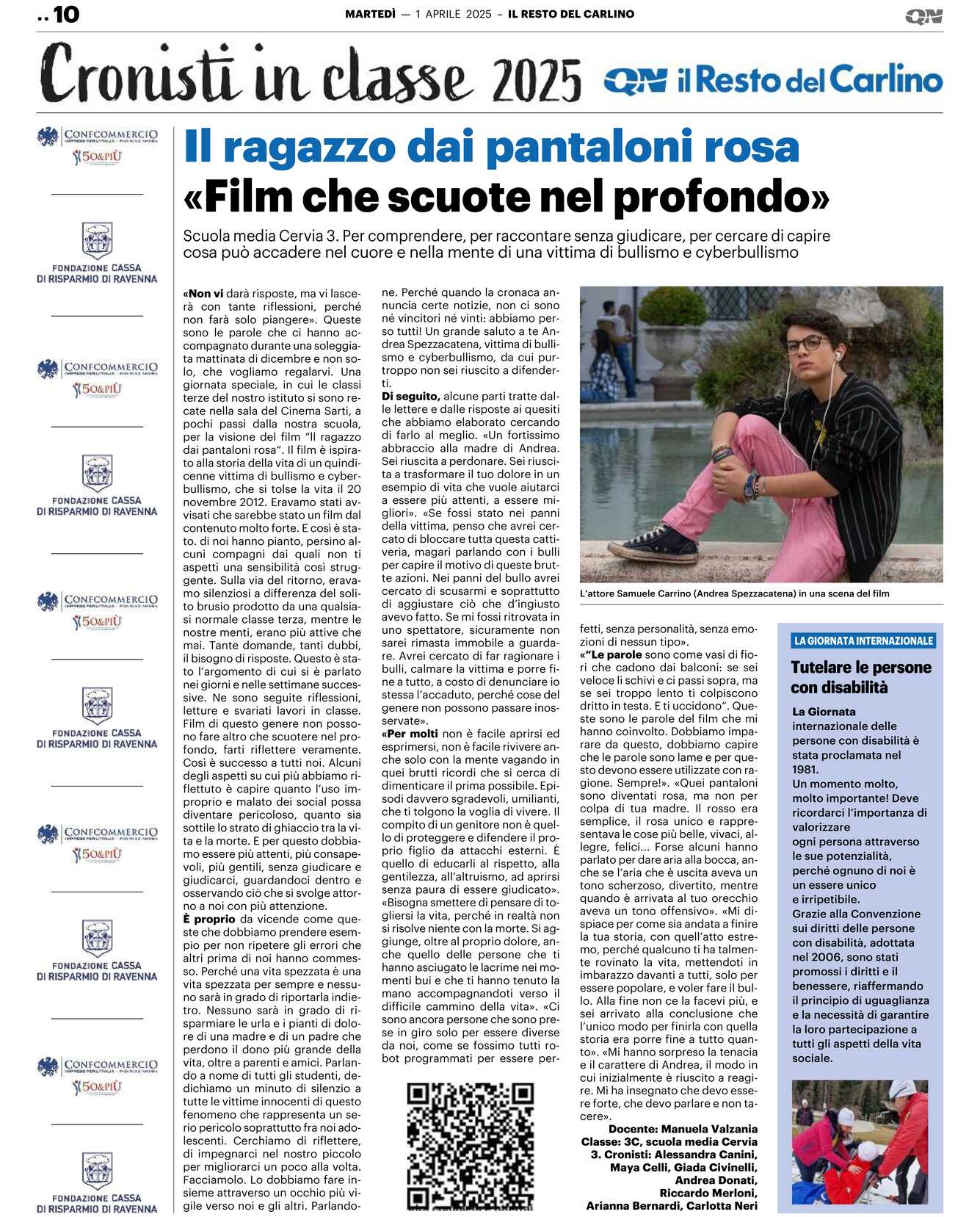 «Non vi darà risposte, ma vi lascerà con tante riflessioni, perché non farà solo piangere». Queste sono le parole che ci hanno accompagnato durante una soleggiata mattinata di dicembre e non solo, che vogliamo regalarvi. Una giornata speciale, in cui le classi terze del nostro istituto si sono recate nella sala del Cinema Sarti, a pochi passi dalla nostra scuola, per la visione del film “Il ragazzo dai pantaloni rosa“. Il film è ispirato alla storia della vita di un quindicenne vittima di bullismo e cyberbullismo, che si tolse la vita il 20 novembre 2012. Eravamo stati avvisati che sarebbe stato un film dal contenuto molto forte. E così è stato. di noi hanno pianto, persino alcuni compagni dai quali non ti aspetti una sensibilità così struggente. Sulla via del ritorno, eravamo silenziosi a differenza del solito brusio prodotto da una qualsiasi normale classe terza, mentre le nostre menti, erano più attive che mai. Tante domande, tanti dubbi, il bisogno di risposte. Questo è stato l’argomento di cui si è parlato nei giorni e nelle settimane successive. Ne sono seguite riflessioni, letture e svariati lavori in classe.