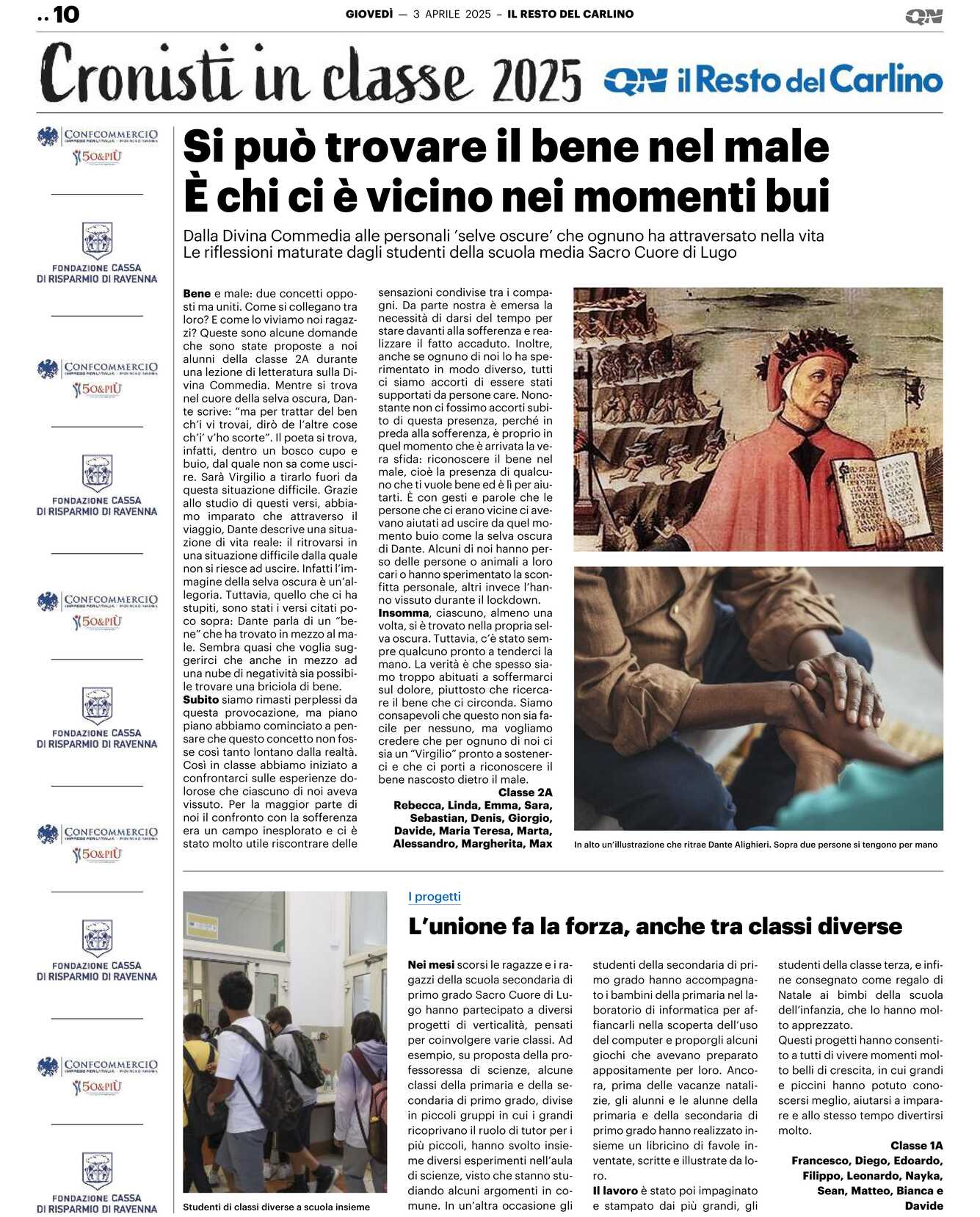 Bene e male: due concetti opposti ma uniti. Come si collegano tra loro? E come lo viviamo noi ragazzi? Queste sono alcune domande che sono state proposte a noi alunni della classe 2A durante una lezione di letteratura sulla Divina Commedia. Mentre si trova nel cuore della selva oscura, Dante scrive: “ma per trattar del ben ch’i vi trovai, dirò de l’altre cose ch’i’ v’ho scorte”. Il poeta si trova, infatti, dentro un bosco cupo e buio, dal quale non sa come uscire. Sarà Virgilio a tirarlo fuori da questa situazione difficile. Grazie allo studio di questi versi, abbiamo imparato che attraverso il viaggio, Dante descrive una situazione di vita reale: il ritrovarsi in una situazione difficile dalla quale non si riesce ad uscire. Infatti l’immagine della selva oscura è un’allegoria. Tuttavia, quello che ci ha stupiti, sono stati i versi citati poco sopra: Dante parla di un “bene” che ha trovato in mezzo al male. Sembra quasi che voglia suggerirci che anche in mezzo ad una nube di negatività sia possibile trovare una briciola di bene.