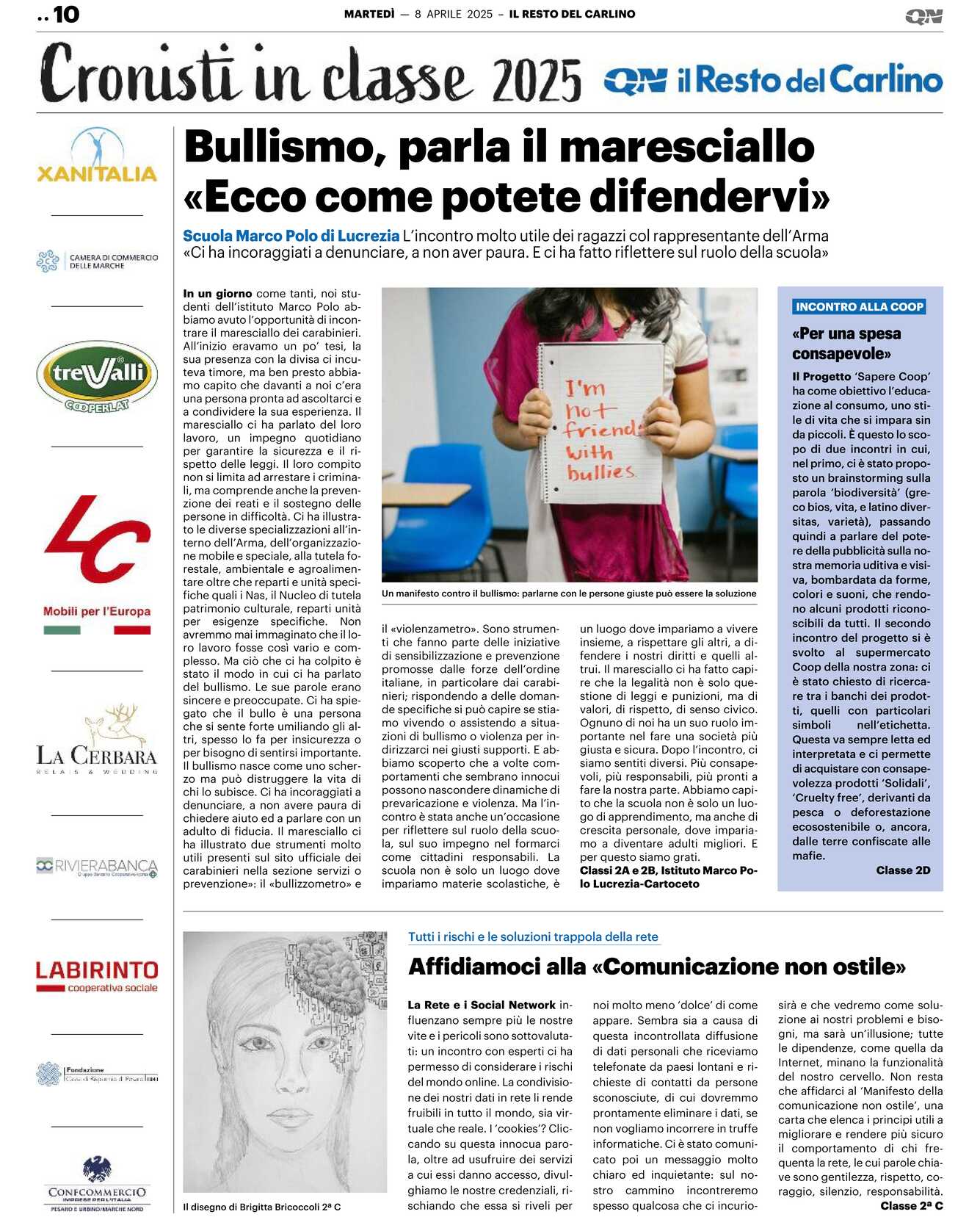 Il bullismo nasce come uno scherzo ma può distruggere la vita di chi lo subisce. Ci ha incoraggiati a denunciare, a non avere paura di chiedere aiuto ed a parlare con un adulto di fiducia. Il maresciallo ci ha illustrato due strumenti molto utili presenti sul sito ufficiale dei carabinieri nella sezione servizi o prevenzione»: il «bullizzometro» e il «violenzametro». Sono strumenti che fanno parte delle iniziative di sensibilizzazione e prevenzione promosse dalle forze dell’ordine italiane, in particolare dai carabinieri; rispondendo a delle domande specifiche si può capire se stiamo vivendo o assistendo a situazioni di bullismo o violenza per indirizzarci nei giusti supporti. E abbiamo scoperto che a volte comportamenti che sembrano innocui possono nascondere dinamiche di prevaricazione e violenza. Ma l’incontro è stata anche un’occasione per riflettere sul ruolo della scuola, sul suo impegno nel formarci come cittadini responsabili. La scuola non è solo un luogo dove impariamo materie scolastiche, è un luogo dove impariamo a vivere insieme, a rispettare gli altri, a difendere i nostri diritti e quelli altrui. Il maresciallo ci ha fatto capire che la legalità non è solo questione di leggi e punizioni, ma di valori, di rispetto, di senso civico.