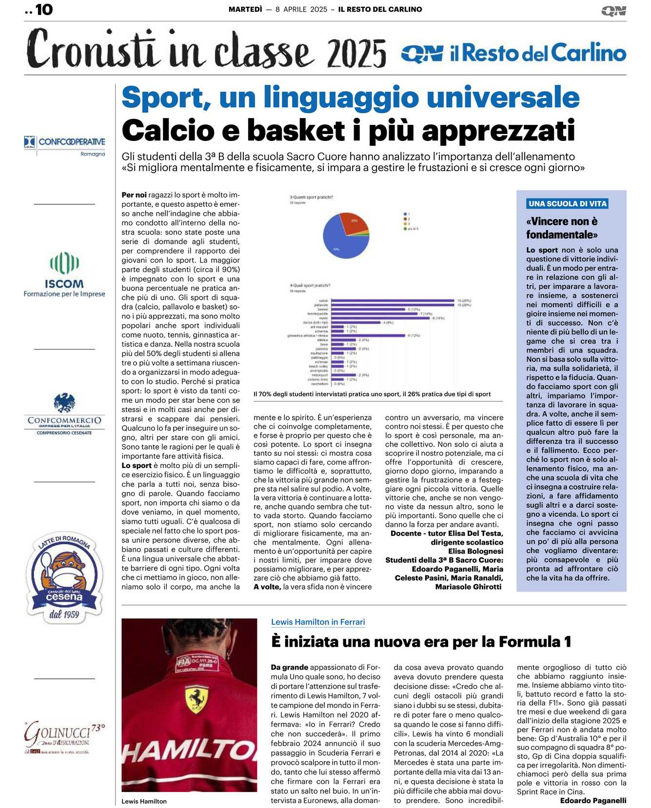 Per noi ragazzi lo sport è molto importante, e questo aspetto è emerso anche nell’indagine che abbiamo condotto all’interno della nostra scuola: sono state poste una serie di domande agli studenti, per comprendere il rapporto dei giovani con lo sport. La maggior parte degli studenti (circa il 90%) è impegnato con lo sport e una buona percentuale ne pratica anche più di uno. Gli sport di squadra (calcio, pallavolo e basket) sono i più apprezzati, ma sono molto popolari anche sport individuali come nuoto, tennis, ginnastica artistica e danza. Nella nostra scuola più del 50% degli studenti si allena tre o più volte a settimana riuscendo a organizzarsi in modo adeguato con lo studio. Perché si pratica sport: lo sport è visto da tanti come un modo per star bene con se stessi e in molti casi anche per distrarsi e scappare dai pensieri.