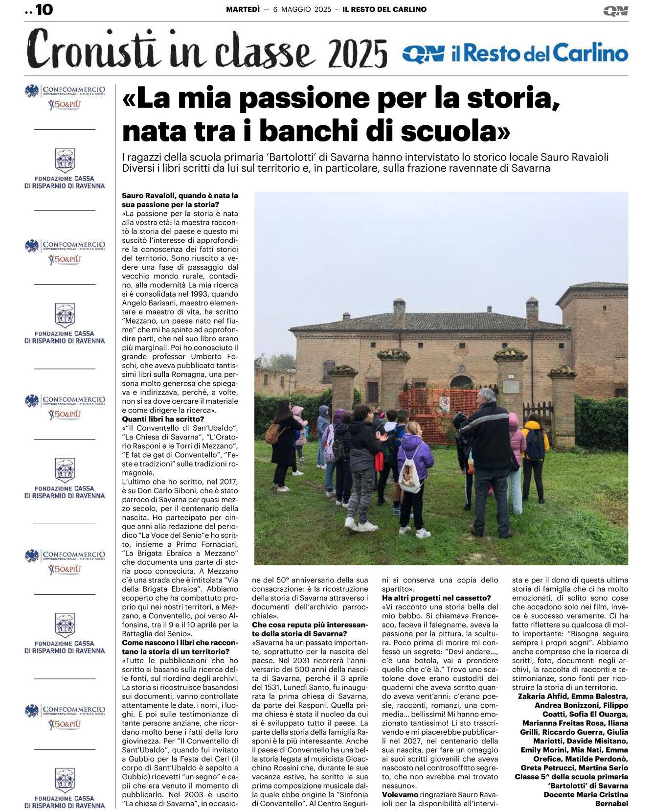I ragazzi della scuola primaria ‘Bartolotti’ di Savarna hanno intervistato lo storico locale Sauro Ravaioli Diversi i libri scritti da lui sul territorio e, in particolare, sulla frazione ravennate di Savarna