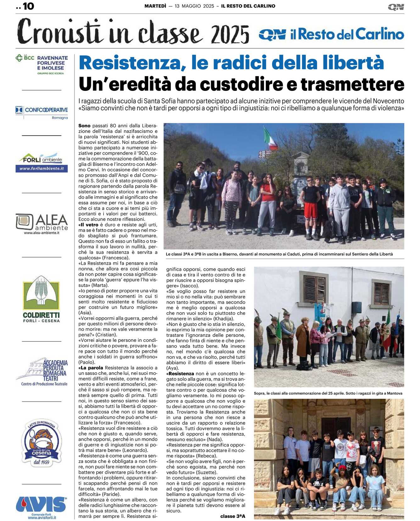 Sono passati 80 anni dalla Liberazione dell’Italia dal nazifascismo e la parola ’resistenza’ si è arricchita di nuovi significati. Noi studenti abbiamo partecipato a numerose iniziative per comprendere il ‘900, come la commemorazione della battaglia di Biserno e l’incontro con Adelmo Cervi. In occasione del concorso promosso dall’Anpi e dal Comune di S. Sofia, ci è stato proposto di ragionare partendo dalla parola Resistenza in senso storico e arrivando alle immagini e al significato che essa assume per noi, in base a ciò che ci sta a cuore e ai temi più importanti e i valori per cui batterci.