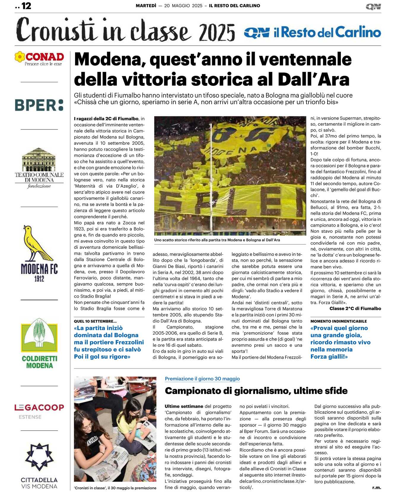 I ragazzi della 2C di Fiumalbo, in occasione dell’imminente ventennale della vittoria storica in Campionato del Modena sul Bologna, avvenuta il 10 settembre 2005, hanno potuto raccogliere la testimonianza d’eccezione di un tifoso che ha assistito a quell’evento, e che con grande emozione lo rivive con queste parole: «Per un bolognese vero, nato nella storica ’Maternità di via D’Azeglio’, è senz’altro atipico avere nel cuore sportivamente il gialloblù canarino, ma se avrete la bontà e la pazienza di leggere questo articolo comprenderete il perché.