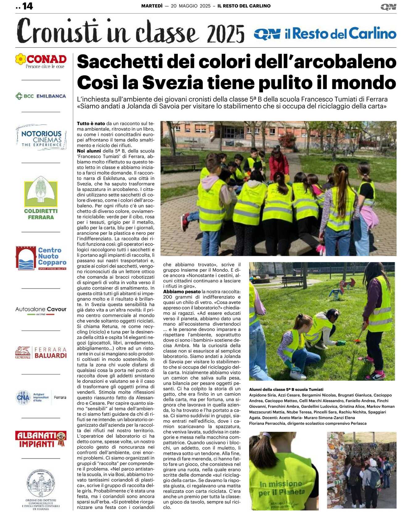 Noi alunni della 5ª B, della scuola ’Francesco Tumiati’ di Ferrara, abbiamo molto riflettuto su questo testo letto in classe e abbiamo iniziato a farci molte domande. Il racconto narra di Eskilstuna, una città in Svezia, che ha saputo trasformare la spazzatura in arcobaleno. I cittadini utilizzano sette sacchetti di colore diverso, come i colori dell’arcobaleno. Per ogni rifiuto c’è un sacchetto di diverso colore, ovviamente riciclabile: verde per il cibo, rosa per i tessuti, grigio per il metallo, giallo per la carta, blu per i giornali, arancione per la plastica e nero per l’indifferenziato. La raccolta dei rifiuti funziona così: gli operatori ecologici raccolgono tutti i sacchetti e li portano agli impianti di raccolta, lì passano sui nastri trasportatori e, grazie ai colori dei sacchetti, vengono riconosciuti da un lettore ottico che comanda ai bracci robotizzati di spingerli di volta in volta verso il giusto container di smaltimento. In questa città tutti gli abitanti si impegnano molto e il risultato è brillante. In Svezia questa sensibilità ha già dato vita a un’altra novità: il primo centro commerciale al mondo che vende soltanto oggetti riciclati.