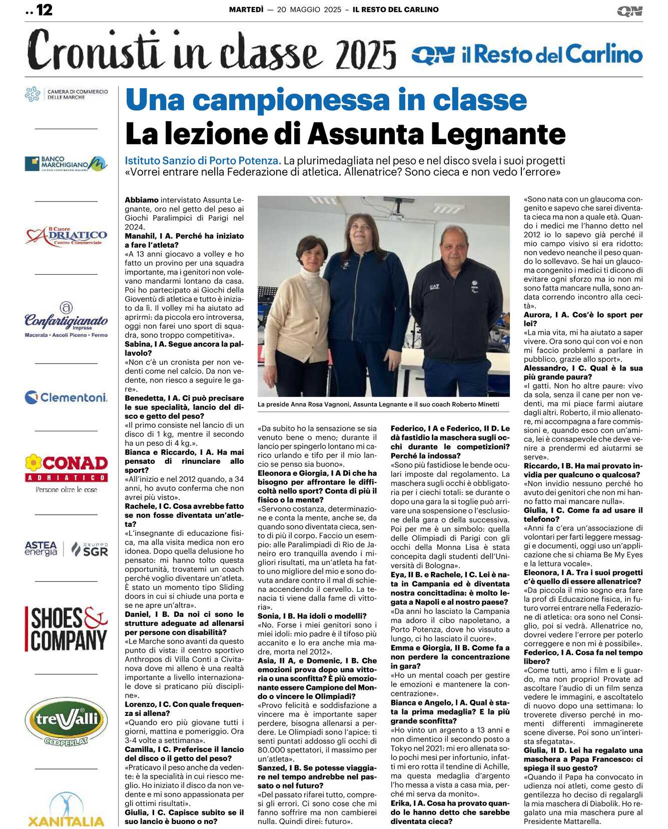 Sanzed, I B. Se potesse viaggiare nel tempo andrebbe nel passato o nel futuro? «Del passato rifarei tutto, compresi gli errori. Ci sono cose che mi fanno soffrire ma non cambierei nulla. Quindi direi: futuro». Federico, I A e Federico, II D. Le dà fastidio la maschera sugli occhi durante le competizioni? Perché la indossa? «Sono più fastidiose le bende oculari imposte dal regolamento. La maschera sugli occhi è obbligatoria per i ciechi totali: se durante o dopo una gara la si toglie può arrivare una sospensione o l’esclusione della gara o della successiva.