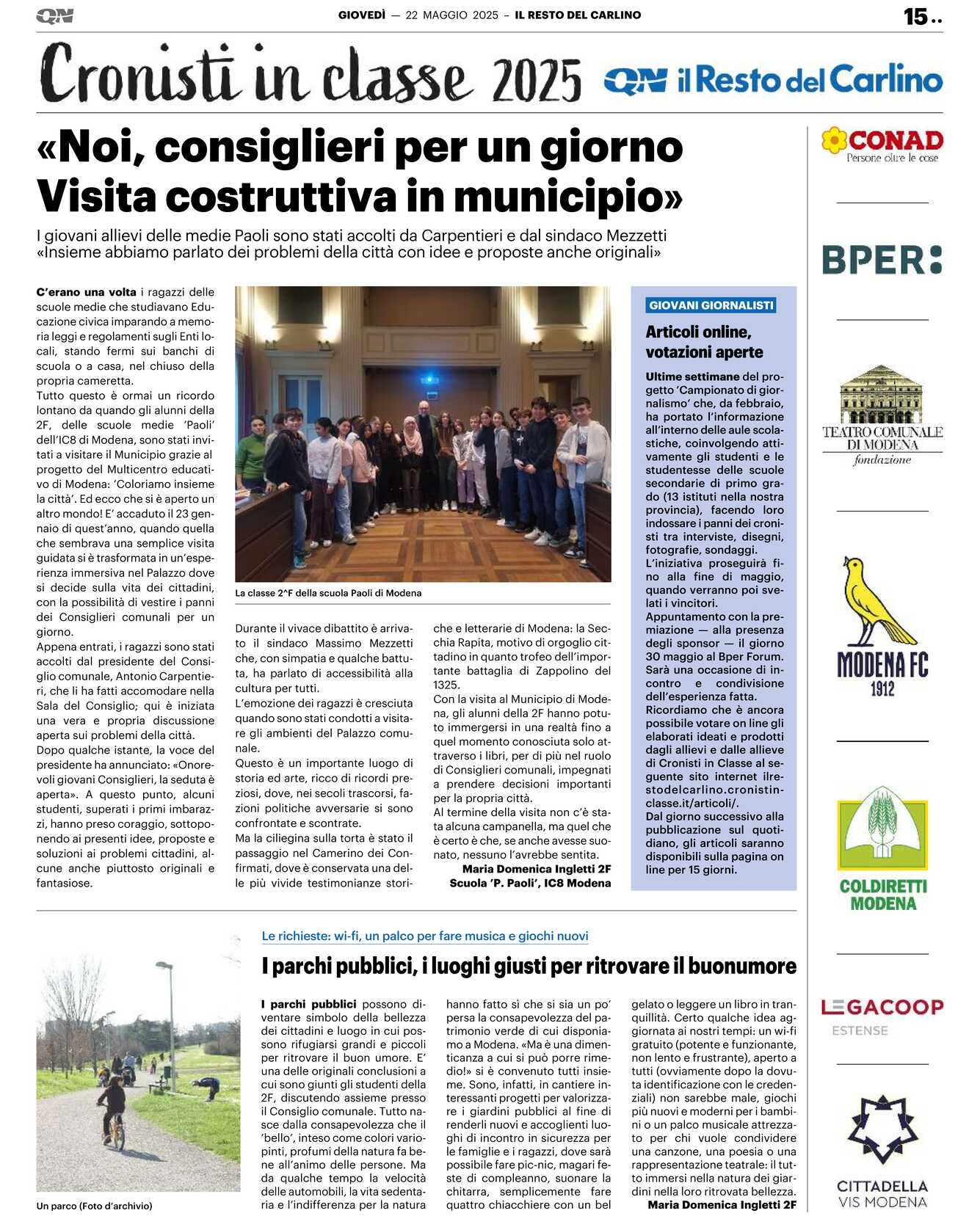 I parchi pubblici possono diventare simbolo della bellezza dei cittadini e luogo in cui possono rifugiarsi grandi e piccoli per ritrovare il buon umore. E’ una delle originali conclusioni a cui sono giunti gli studenti della 2F, discutendo assieme presso il Consiglio comunale. Tutto nasce dalla consapevolezza che il ’bello’, inteso come colori variopinti, profumi della natura fa bene all’animo delle persone. Ma da qualche tempo la velocità delle automobili, la vita sedentaria e l’indifferenza per la natura hanno fatto sì che si sia un po’ persa la consapevolezza del patrimonio verde di cui disponiamo a Modena. «Ma è una dimenticanza a cui si può porre rimedio!» si è convenuto tutti insieme. Sono, infatti, in cantiere interessanti progetti per valorizzare i giardini pubblici al fine di renderli nuovi e accoglienti luoghi di incontro in sicurezza per le famiglie e i ragazzi, dove sarà possibile fare pic-nic, magari feste di compleanno, suonare la chitarra, semplicemente fare quattro chiacchiere con un bel gelato o leggere un libro in tranquillità. Certo qualche idea aggiornata ai nostri tempi: un wi-fi gratuito (potente e funzionante, non lento e frustrante), aperto a tutti (ovviamente dopo la dovuta identificazione con le credenziali) non sarebbe male, giochi più nuovi e moderni per i bambini o un palco musicale attrezzato per chi vuole condividere una canzone, una poesia o una rappresentazione teatrale: il tutto immersi nella natura dei giardini nella loro ritrovata bellezza.